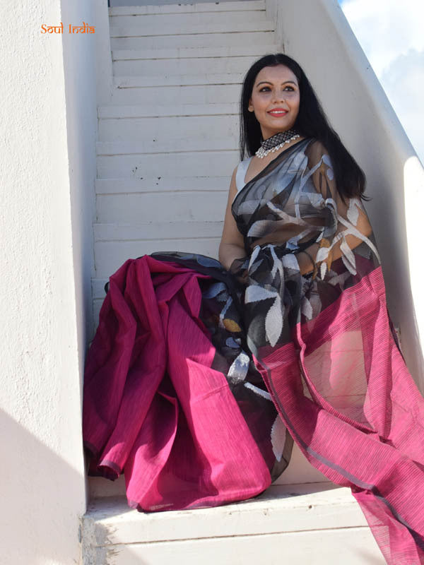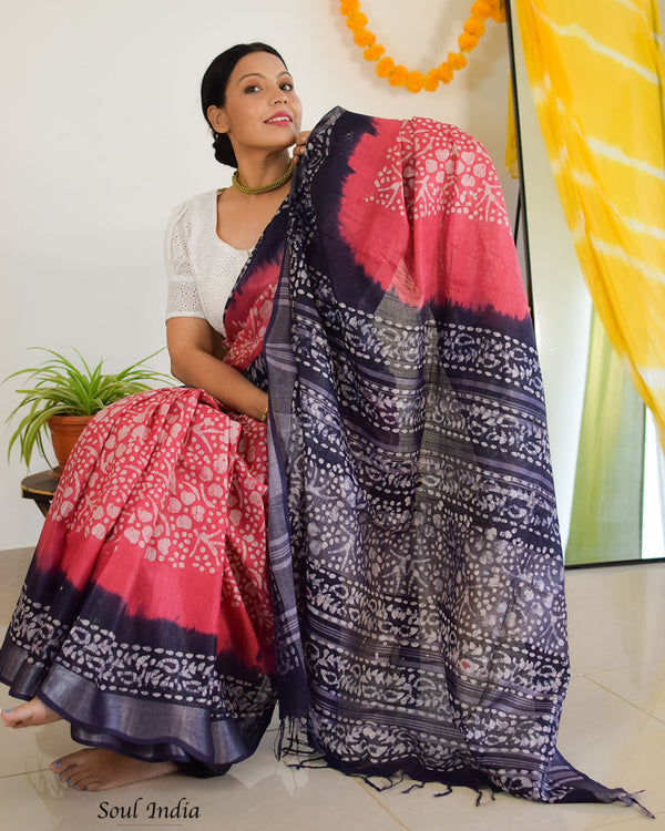 Handloom Cotton Linen Blend Batik Saree - Pink